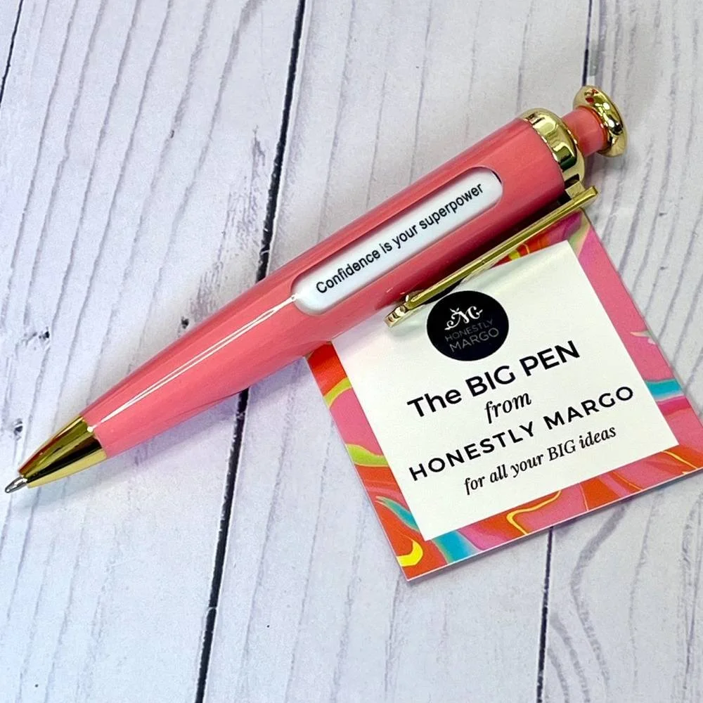 A BIG pen for all your BIG ideas! The BIG pen is a ballpoint pen with black ink that features 2 windows that rotate through six messages of empowerment, encouragement and positivity.